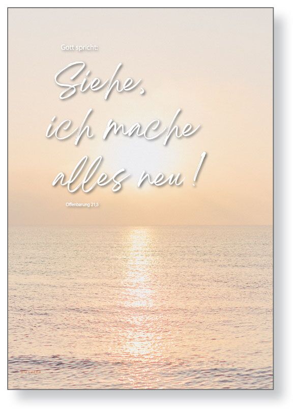 Diese Aussage aus der Offenbarung - dem letzten Kapitel der Bibel - beschreibt, was uns erwartet, wenn wir in Gottes neue Welt aufgenommen werden. Von einem neuen Himmel und einer neuen Erde wird berichtet, ohne Angst, Hass, ohne Leid, ohne Krankheit, ohne Tränen - mit einem ganz neuen Dasein... Etwas unbeschreiblich Schönes liegt vor uns, wenn wir dem glauben und vertrauen: eine Welt, die wir mit unseren jetzigen Sinnen gar nicht erfassen könnten. Jetzt sehn wir unsere Welt nur wie durch einen Spiegel. Die Bibel sagt uns aber, was sich hinter dem Spiegel verbirgt: Wir werden Gott von Angesicht zu Angesicht sehen und alles wird von unfassbarem, wärmenden Licht und großer Freude geprägt sein. Welch eine wunderbare Aussicht!